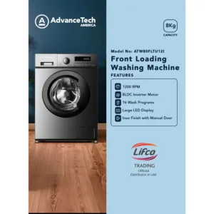 The AdvanceTech America Front Load Washer 8 kg – ATW80FLTUI21 delivers thorough cleaning with advanced washing technology. Its efficient cycle settings help remove tough stains while caring for various fabric types.