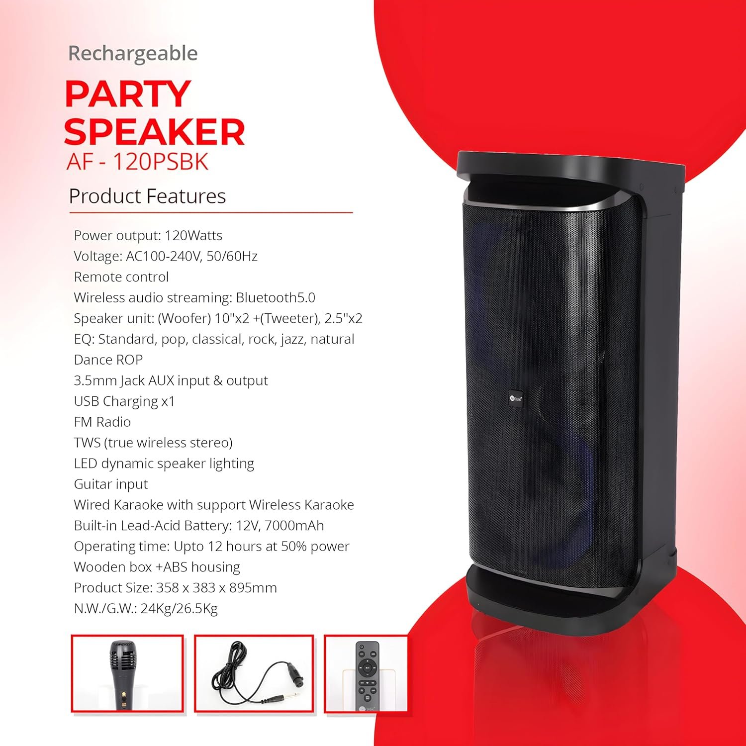 AFRA Party Speaker, 120 Watts, 24kg, Black, 7000Ma Battery, Karaoke Mic, LED Speaker Lighting, AF-120PSBK, 2 Years Warranty