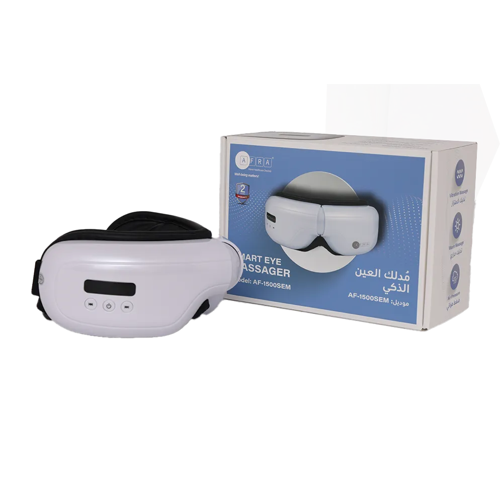 Experience advanced eye care with the AFRA Smart Eye Massager AF-1500SEM. Equipped with a 1200mAh rechargeable battery and Bluetooth connectivity, it offers multiple modes including Integrated, Clear, Sleep, Vitality, and Smart. Combining vibration massage, warm massage, and air pressure, it effectively relieves eye strain, fatigue, and dryness. Ergonomically designed for comfort, this lightweight massager is perfect for home, office, or travel use. Recharge, relax, and rejuvenate your eyes anytime