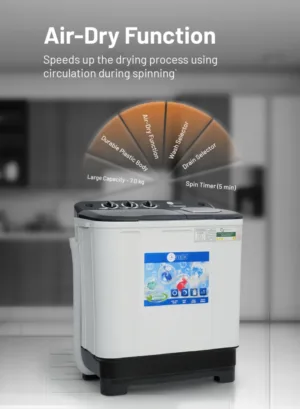 The Twin Tub Washing Machine is a compact yet powerful washer that can tackle your daily laundry needs with ease. Offering a 7kg wash capacity and 5kg spin capacity, this machine is designed for busy families and small households. Equipped with advanced features like the air dry function, magic filter, and dedicated collar and cuff washboard, this twin tub washer will help you get cleaner, fresher clothes in less time.