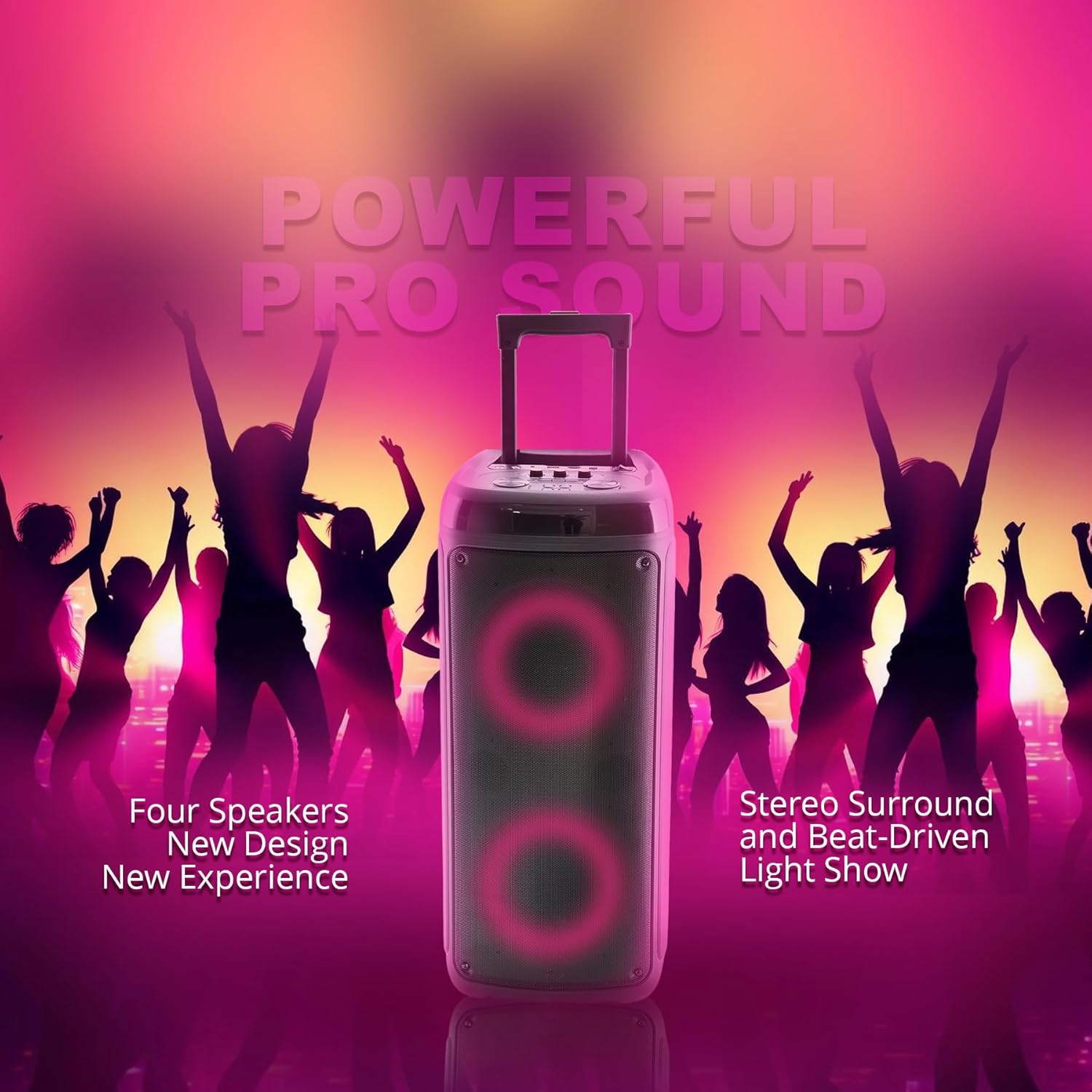 Experience powerful audio with the versatile and portable speaker system. Enjoy seamless wireless streaming and multiple input options for convenience. Dual speaker units and vibrant LED lighting create an immersive ambiance. With true wireless stereo support and long-lasting battery life, it’s perfect for on-the-go entertainment and impromptu performances.