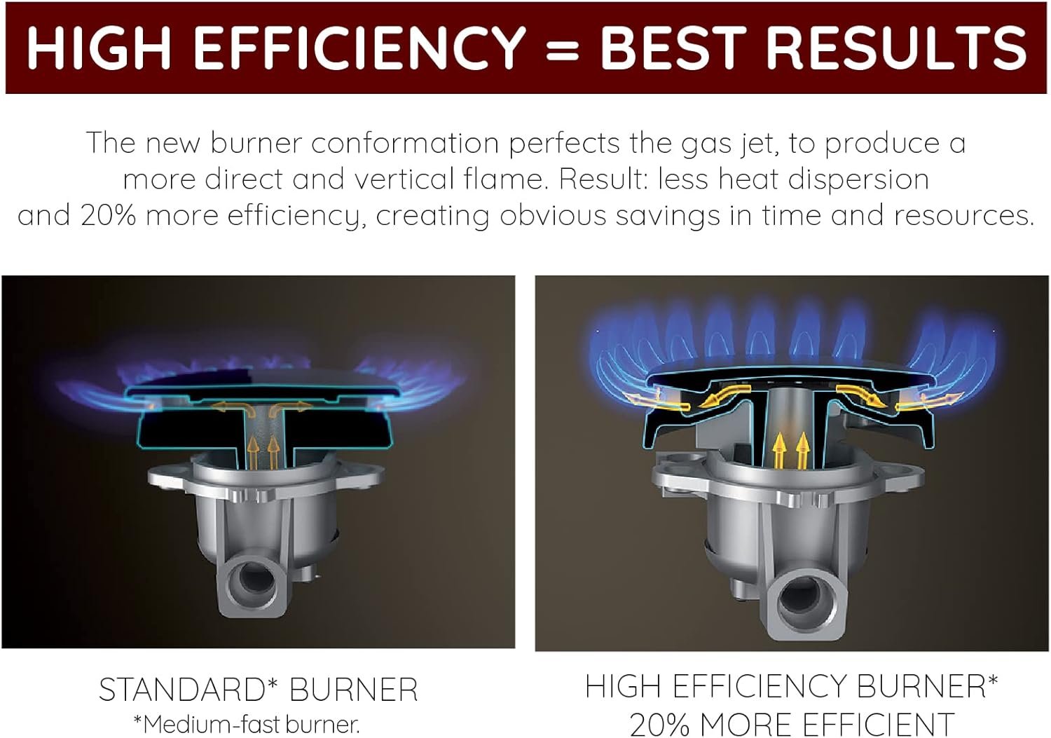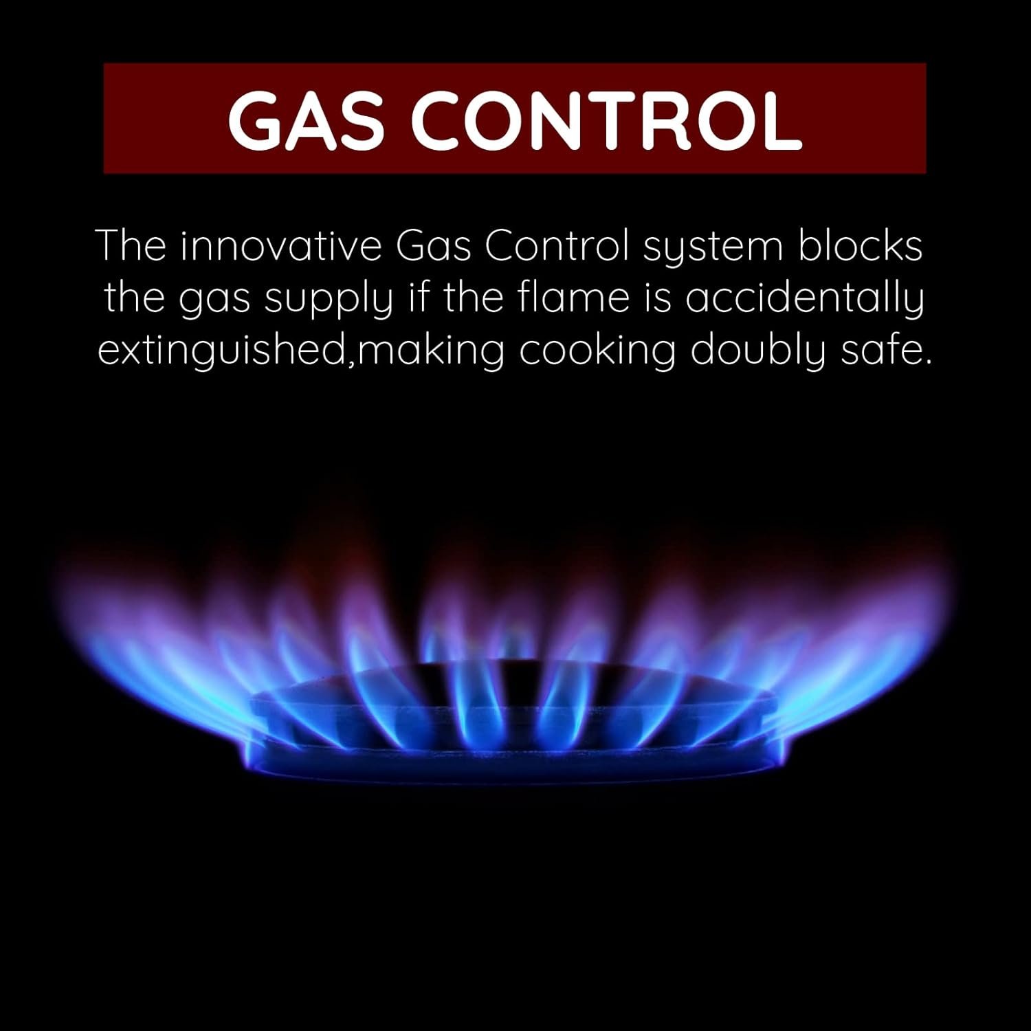 Special Features : ● 5 Gas burners Including Triple Crown(Sabaf), ● Automatic One Hand ignition, ● Cast Iron grids, ● Deep tray, Skewer Turnspit, ● Full glass inner door