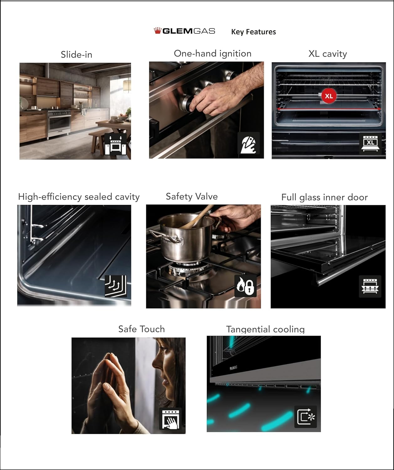 GLEMGAS 90X60 Freestanding Cooker, 5 Burner Gas Cooking Range, With One Hand Ignition With Full Safety, Cast Iron Pan support, Closed Door Grilling, MADE IN ITALY -ST9612RIFS