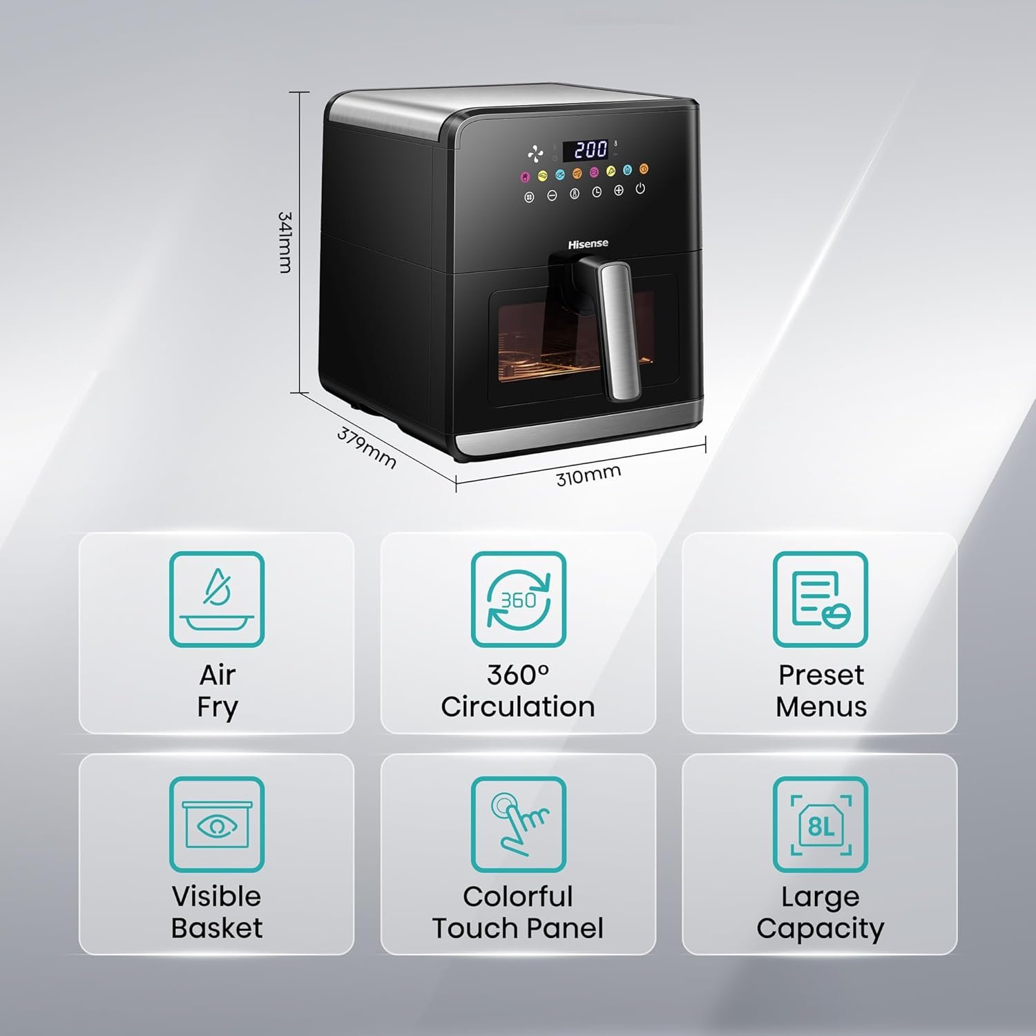 Hisense 1700Watts Air Fryer with Colorful Touch Panel and Visible Cooking Window, 8 Litre Capacity, Black – H09AFBKS4S