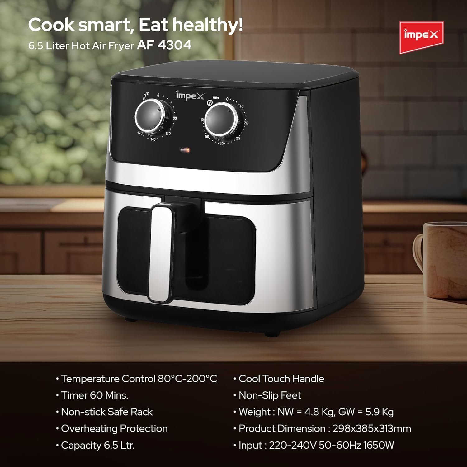 IMPEX 6L Mechanical Air Fryer – 6L Big Pot, 5.8L Non-Stick Frying Basket, 80-200°C Temperature Setting, 60 Min Timer, With 2 year Warranty Black-AF 4304