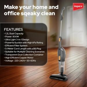 Experience the ultimate convenience in home cleaning with our ultra-lightweight 3-in-1 vacuum cleaner, designed for powerful performance and effortless handling. With an 800W high-efficiency copper motor, this vacuum delivers strong suction power with a high KPa rating, ensuring effective dirt and debris removal from carpets, hardwood floors, tiles, and upholstery. The 1.2L transparent dust collection container allows you to monitor dust levels easily, reducing the hassle of frequent emptying. Featuring an advanced filtration system, it efficiently traps dust, allergens, and fine particles, making it ideal for homes with pets and allergy sufferers. This versatile vacuum operates on 220-240V~ 50-60Hz, ensuring compatibility with standard electrical outlets, while the 5-meter power cord with a BS plug provides extended reach for effortless whole-room cleaning.