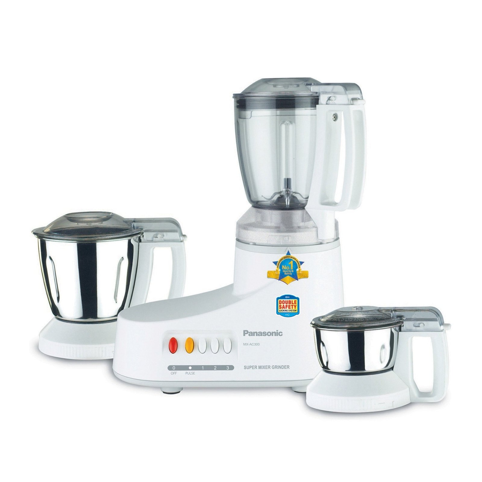 - Complete all your grinding tasks with ease using the Panasonic MXAC300 mixer grinder. Thanks to the powerful 360W motor and superior Samurai edge blades, the Panasonic mixer grinder is sure to impress you with its grinding efficiency.Powerful BlenderThis mixer grinder comes with a blender, mill jar. Be it blending, mixing or grinding, the Panasonic super mixer grinder lets you complete your tasks in the kitchen with maximum speed and ease. The stainless steel and polycarbonate construction of the jars make them sturdy and durable.Double Locking Safety SystemThe Panasonic Super Mixer Grinder has a double lock safety system, flow beaker jars, and it also comes with circuit breaker protection in case of a power failure. The magic seal protection prevents leakage and you can mix and blend anything with ease.